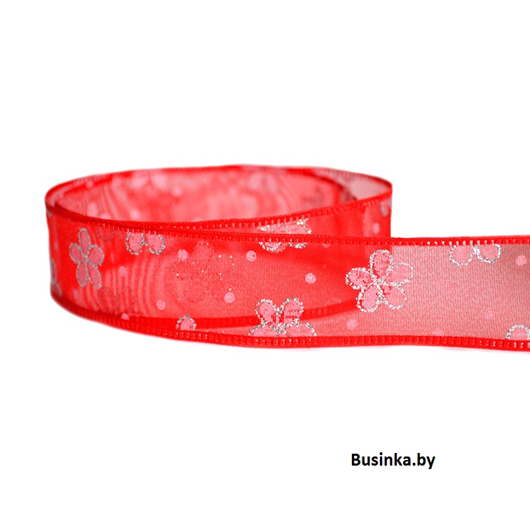 Лента “Цветочки с блёстками” 2.5 см, красный (1 метр)