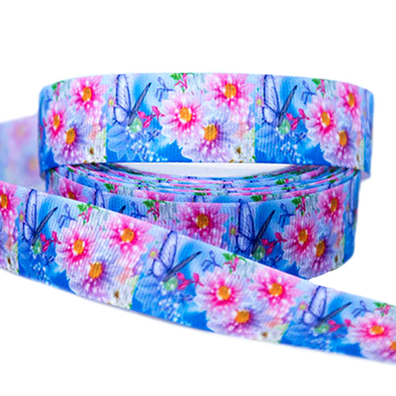 Репсовая лента “Цветы с бабочками” 2,5 см (1м)