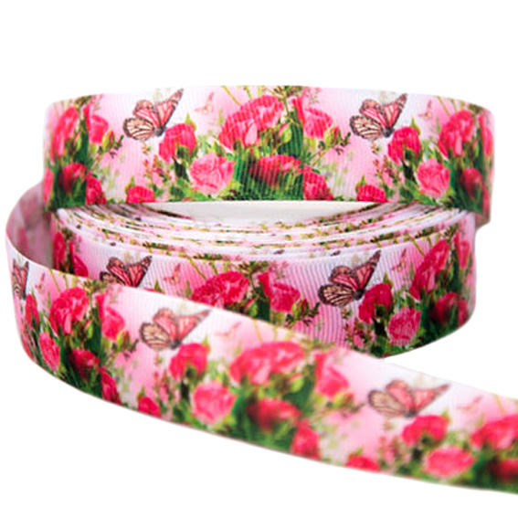 Репсовая лента “Цветы с бабочками” 2,5 см (1м)