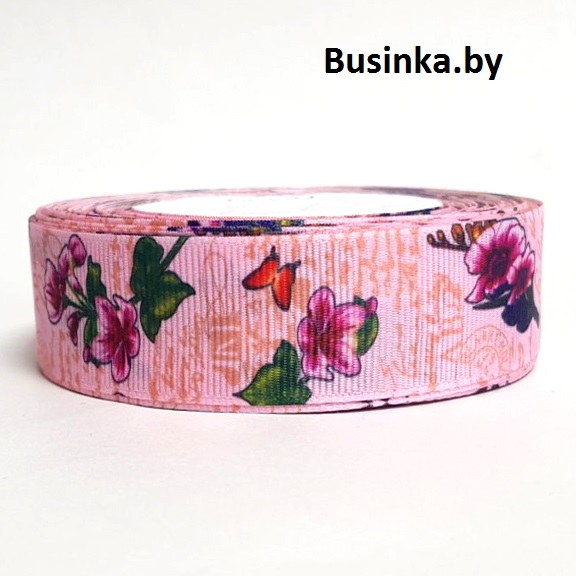 Репсовая лента “Цветы с бабочками” 2,5 см (1м)