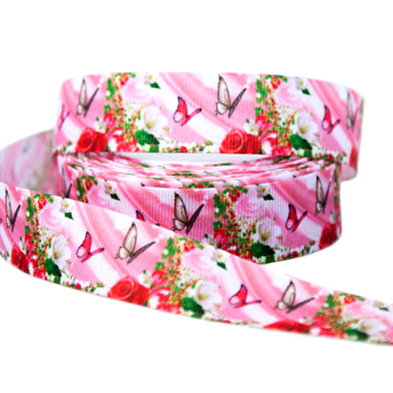 Репсовая лента “Цветы с бабочками” 2,5 см (1м)